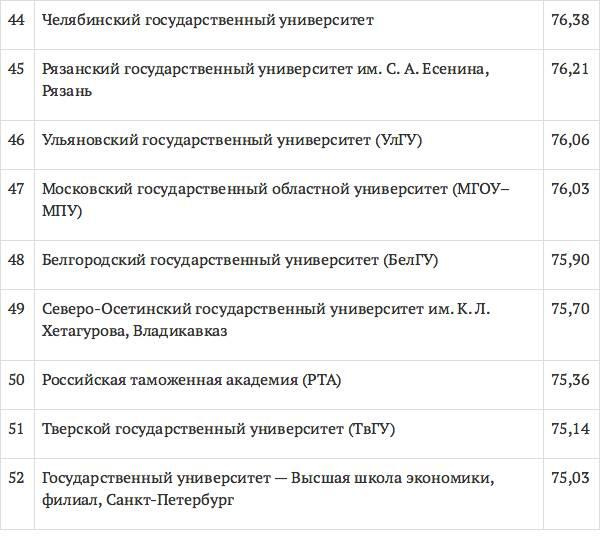 Но в целом рейтинги дают представление о лидерах юридического образования. Представим для примера два рейтинга юридических вузов, составленных достаточно авторитетными экспертами: опросный рейтинг (составлен по результатам опроса ректоров, выпускников, работодателей и профессионального сообщества) (табл. 2)18 и рейтинг по баллу ЕГЭ (составлен на основе среднего балла ЕГЭ по одному предмету, достаточному для поступления на юридический факультет / в юридический вуз) (табл. 3)19.