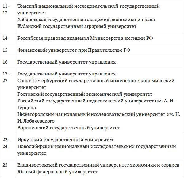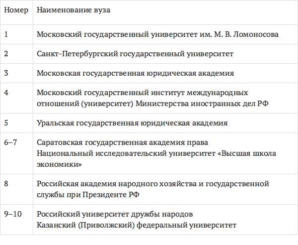 Чтобы составить список вузов, целесообразно не только руководствоваться требованиями работодателей, но и использовать рейтинги, советоваться с практикующими юристами, чтобы получить более комплексное и глубокое мнение. Отметим, что специализированных юридических вузов, которые готовят исключительно юристов, не так много, и это не является определяющим показателем, поскольку с ними успешно конкурируют юридические факультеты универсальных вузов.