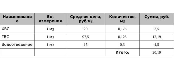 На сегодняшний день нормативное потребление воды в день 1 человеком составляет 300 литров, из которых на холодную воду приходится 175 литров, а на горячую 125 литров, соответственно, водоотведение на 1 человека составит 300 литров. Реальное водопотребление значительно ниже, а в период отпусков отсутствует вовсе. Произведем расчет затрат: