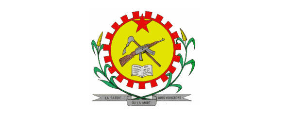 Золотой диск наложен поверх красного зубчатого колеса, символизирующего индустриализацию страны. Колесо полуобрамлено двумя зелеными стеблями сорго с золотыми колосьями, символизирующими сельское хозяйство основу экономики страны. В нижней части герба серебряная лента с девизом: «LA PATRIE OU LA MORT NOUS VAINCRONS» («Отечество или смерть, мы победим»).