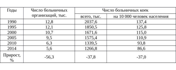 За анализируемый период число больничных организаций снизилось на 56,3%, больничных коек на 37,8%, больничных коек на 10000 человек населения на 37,0%.