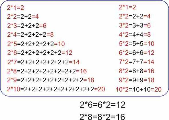 Рисунок 8. Таблица Пифагора с примерами умножения на 2 (синим цветом)
