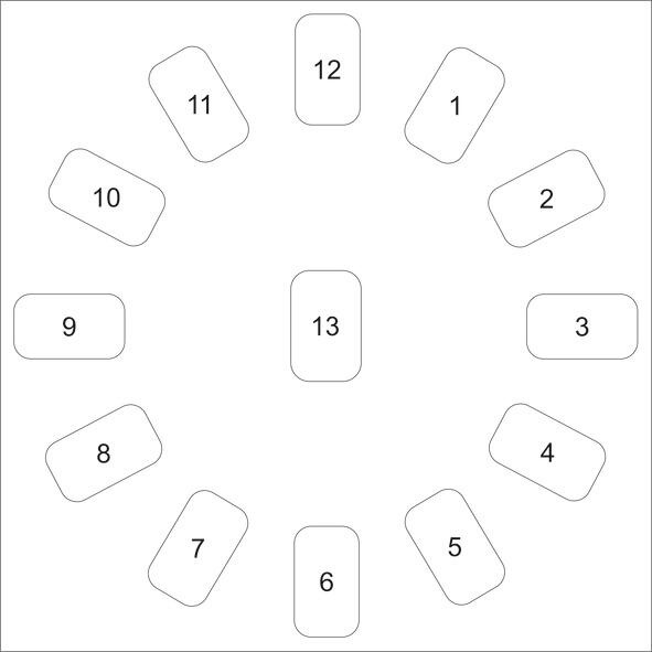 Итак, вечером под новый год перемешайте колоду. И разложите по кругу в том порядке, в котором указанно на рисунке.