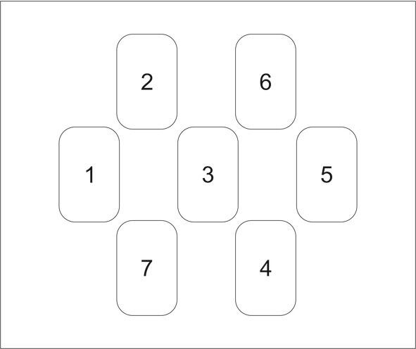 Итак, перемешайте колоду думая о вопросе. Положите ее в центр перед собой. Вытащите 7 карт и разложите их по кругу, как указанно на рисунке.