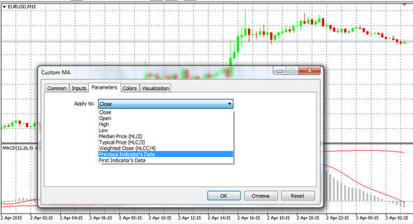 Здесь пункт First Indicators Data означает, что в качестве массива price [] будет использоваться массив ExtMacdBuffer буфера индикатора MACD, а пункт Previous Indicators Data означает, что в качестве массива price [] будет использоваться массив ExtLineBuffer буфера индикатора MA.
