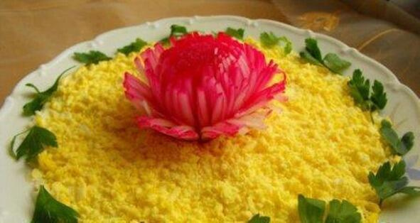 Приготовление: печень трески размять вилкой и уложить на дно салатника. Морковь натереть на мелкой тёрке и уложить поверх печени. Посыпать сыром, натёртым на мелкой тёрке. Смазать майонезом. Яйца очистить и отделить белки от желтков. Белки натереть на мелкой тёрке, выложить поверх сыра и смазать майонезом. Посыпать натёртым на мелкой тёрке желтком. Чтобы сделать хризантему, луковицу разрезать на части, не дорезая до основания примерно 0,5 сантиметра. В подходящую ёмкость налейте воду комнатной температуры добавив, при желании немного сахара уксуса. Поместите луковицу в воду, вода должна закрывать луковицу полностью. Через 12 часа «хризантема» из лука должна раскрыться. Окрасьте её свекольным соком и поместите на салат.