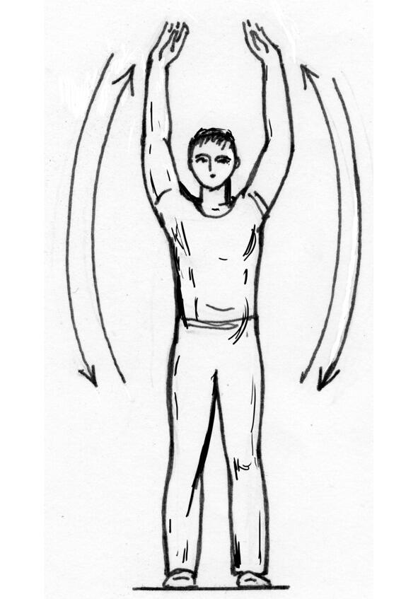 Начинается это упражнение, так же как и предыдущее. То есть на вдох вы поднимаете руки к небу, на выдох руки так же через стороны опускаете вниз. При этом постарайтесь сделать так, что к концу движения рук вы уже полностью выдохнули весь воздух, который находился у вас в легких. (Без паники! Лишиться всего воздуха, который был и есть внутри, вам все равно не удастся. В легких всегда находится запас, препятствующий их схлопыванию.) «Освобождаясь» от воздуха вы касаетесь внутренними сторонами запястий обеих рук.