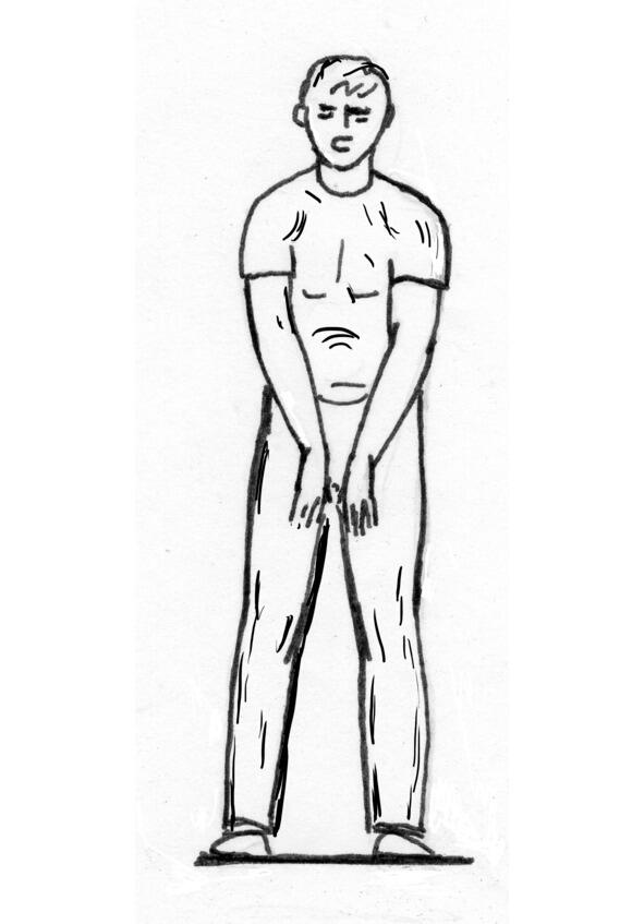 Когда у вас возникнет ощущение, что вы выдохнули весь воздух, начинайте опускать корпус вниз, стоя на прямых ногах и перевернув руки, слегка постукивая, внешней стороной запястья, друг об друга.