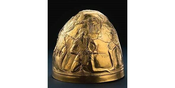 По одной из версий, сюжет, изображенный на головном уборе, связан с боем 6 скифов, где участвуют 4 юноши и 2 взрослых бородатых воина. По другой версии, здесь показана известная скифская легендой о трех братьях. Все изображения исполнены в реалистической манере, фигуры воинов отличаются удивительной динамичностью. Композиция состоит из двух частей, очень похожих по сюжету схватка пожилого скифа с двумя юношами. Фигуры, объеденные в две сражающихся тройки, практически занимают всю поверхность предмета. Они связаны между собой идеей парности и объединены единым психологическим центром юношей, стоящего на коленях. Собственно, вокруг него и из-за него идет сражение.