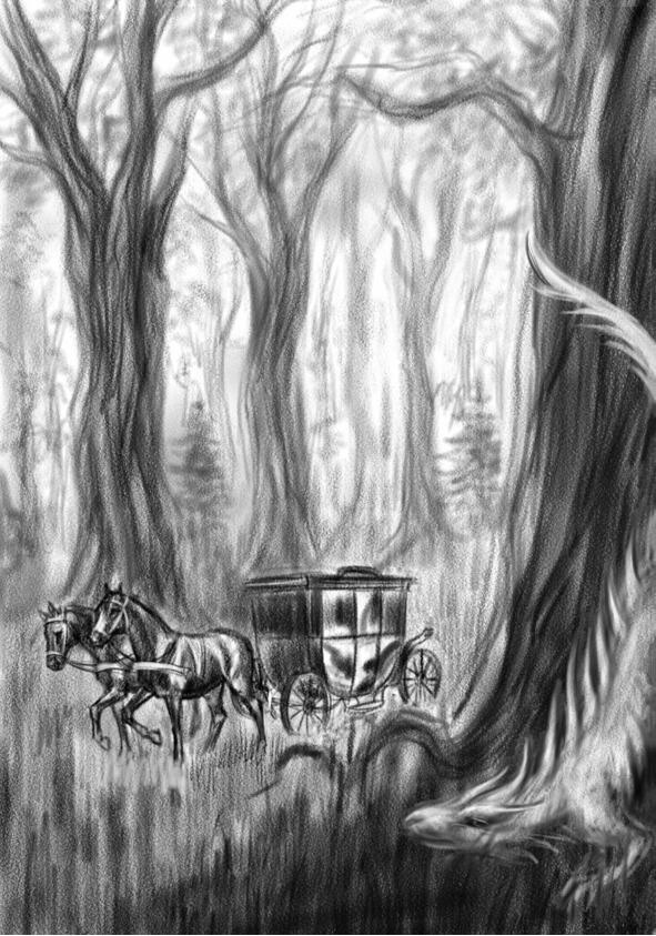 В это время бедная Люси решила взять себя в руки, перестать трястись от холода и посмотреть куда же они едут. Она с трудом взобралась на крышу кареты, жмурясь от сильного ветра. Онемевшие от холода пальцы скользили по золочёной поверхности крыши, крылья цеплялись за резные надписи: «С «Гоблин банком» ты богат», «Гоблин банк» будет с тобой до конца твоих дней» и прочее. Прислонившись спиной к султану из страусовых перьев, венчавшему крышу кареты, фея огляделась. Они ехали по очень странному лесу. Деревья были словно покрыты густым слоем пепла, и под его бархатным мехом проглядывали чёрные угольные стволы. Такой же пепельной и хрупкой была трава, тронь и рассыплется в пыль. Ни один рыжий или алый лист не нарушал темноты, клубящейся между деревьев. Не было слышно ни птиц, ни зверей, только ветер, который казался здесь единственным живым существом, качал узловатые мёртвые ветви, отчего те пронзительно скрипели. Особенно сильные его порывы ломали хрупкие истлевшие кончики травы, превращая их в пыль и туман. Словно живая мгла ползла по поверхности земли. Сердце Люси бешено застучало.