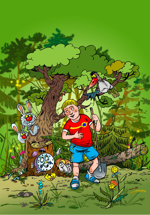 Вечером Мишаня спрятал будильник в мусорное ведро. Но тот выбрался и на следующее утро опять устроил жуткий ад. Тогда мальчишка, прихватив с собой лопату, отнес его в лес, подальше от дома. И для верности закопал глубоко в землю.