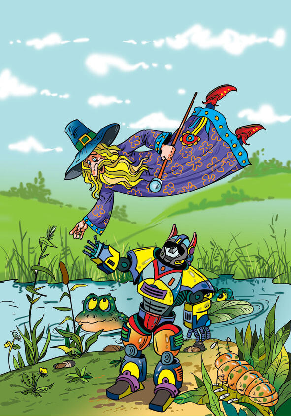 Волшебнику не терпелось искупаться, и они все вместе полетели на пруд. Вода была уже холодная, но волшебник сделал ее теплой. И это очень понравилось. Даже рыбам! От радости они выпрыгивали из воды, и волшебник на время им всем приделал крылышки. И еще сделал их говорящими.