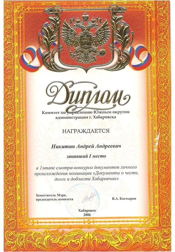 Диплом за 1 место в номинации: «Документы о чести, долге и доблести хабаровчан». Фото: Алина Аболончик.