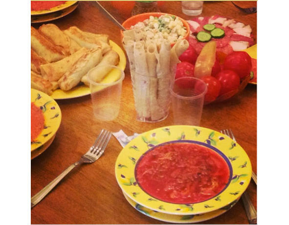 Родители приготовили вкусный обед борщ и блинчики с мясной начинкой.