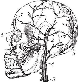 1 ветви a. temporalis superficialis; 2 a. temporalis superficialis; 3 a. occipitalis; 4 a. carotis externa;5 a. carotis communis; 6 a. supratrochlearis; 7 a. supraorbitalis