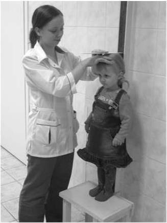Измерение длины тела детей от 1 года до 3 лет производят с помощью ростомера с откидным табуретом или подвижного антропометра. На вертикальной стойке ростомера нанесены 2 шкалы: одна (справа) для измерения длины тела стоя, другая (слева) длины корпуса (длины тела сидя). Ребенка ставят ногами на откидную скамейку спиной к шкале, а отсчет длины тела ведут по шкале слева. Тело ребенка должно быть выпрямлено, руки свободно опущены, колени разогнуты, стопы плотно сдвинуты. При правильной установке ребенка пятки, ягодицы, межлопаточная область и затылок должны касаться вертикальной стойки ростомера. Голова устанавливается в положении, при котором наружный край глазницы и верхний край козелка уха находятся в одной горизонтальной плоскости. Подвижная планка подводится к голове без надавливания (рис. 10).