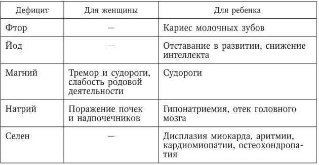 Не менее серьезной проблемой является и недостаточное питание матери. Так, по данным И. М. Воронцова, частота белково-энергетич еской недостаточности у беременных и кормящих матерей в настоящее время достигает 50 %, а дефицит микронутриентов различной степени 70 %. Хорошо изучены последствия для ребенка недостатка в рационе беременной женщины некоторых нутриентов (табл. 1).