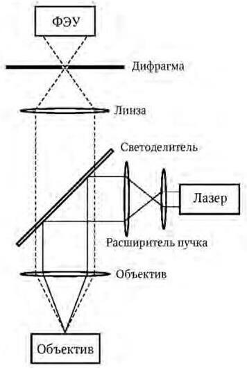 В современном конфокальном микроскопе источником возбуждающего света является лазер. Преимуществом лазеров по сравнению с ламповыми источниками света заключается в монохроматичности генерируемого света и малой расходимости светового пучка. Монохроматичность возбуждающего флуоресценцию света дает возможность расширить спектральный диапазон регистрируемой флуоресценции и улучшить подавление светорассеяния на длине волны возбуждения. Малая расходимость пучка света способствует более эффективной работе оптической системы микроскопа, уменьшает число бликов, связанных с отклонением света от расчетного оптического пути, улучшает точность фокусировки пучка света и уменьшает объем, в который можно сфокусировать свет на образце. На рис. 2 показана принципиальная схема современного лазерного конфокального микроскопа.