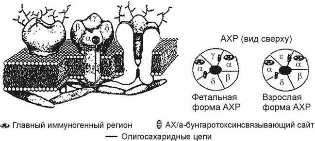 Мышечный эмбриональный АХР имеет g-субъединицу, которая у взрослых заменяется на e-субъединицу (Vincent А., 1988).
