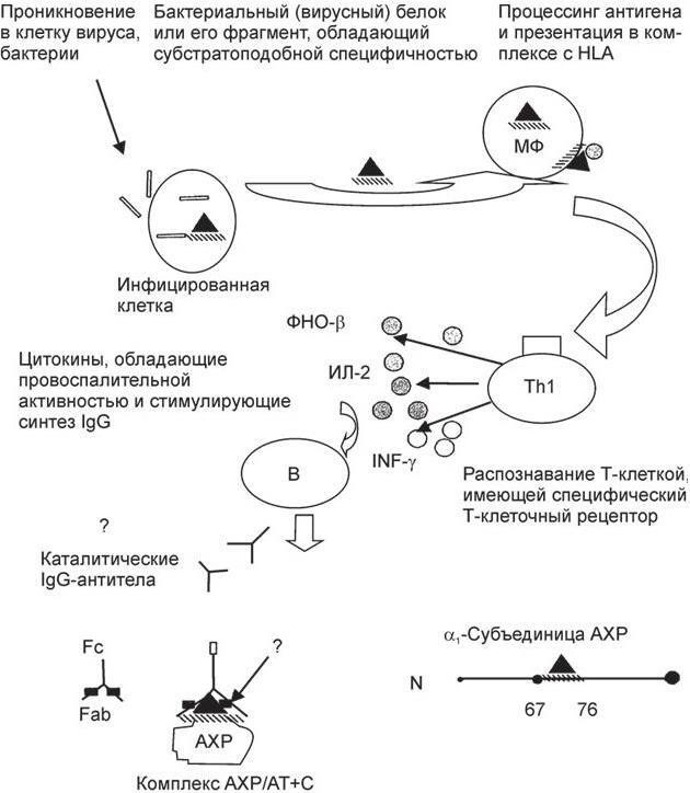 Существующее в течение 50 лет предположение о том, что одной из причин заболевания миастенией может быть инфекционный агент, подтверждается новыми данными о развитии аутоиммунного процесса в ответ на инфицирование по типу молекулярной мимикрии с образованием высокоаффинных аутоАТ, обладающих абзимной активностью. Возможный механизм возникновения абзимной активности приведен на схеме 1.