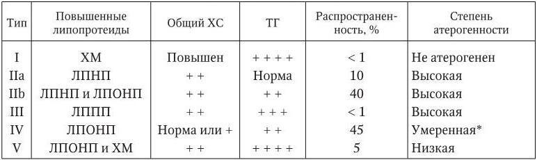 *IV тип является атерогенным, если ему сопутствует низкая концентрация ХС ЛПВП, а также другие метаболические нарушения: гипергликемия, инсулинорезистентность, нарушение толерантности к глюкозе.