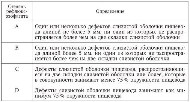 Эндоскопическая диагностика рефлюкс-эзофагита с нарушением целостности слизистой оболочки пищевода проводится согласно Лос-Анджелесской классификации 1994 г., при использовании которой в зависимости от объема поражения слизистой оболочки выделяют четыре степени рефлюкс-эзофагита (табл. 1).
