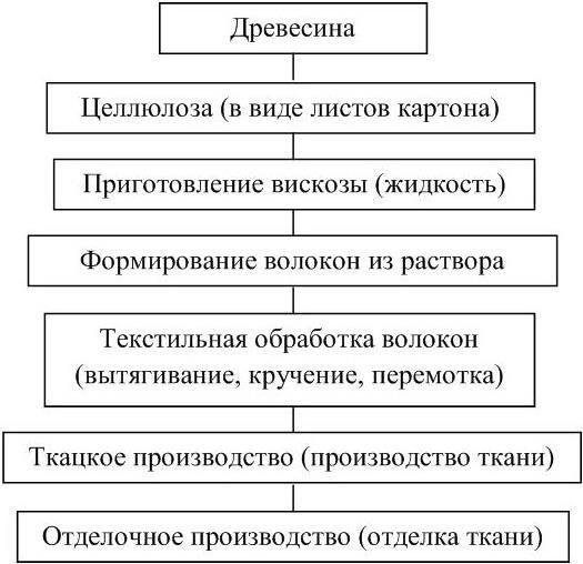 Вискозные ткани могут напоминать шелк, шерсть в зависимости от обработки волокон. Для вискозных тканей также характерен единый процесс производства, состоящий из нескольких стадий (рисунок 11).