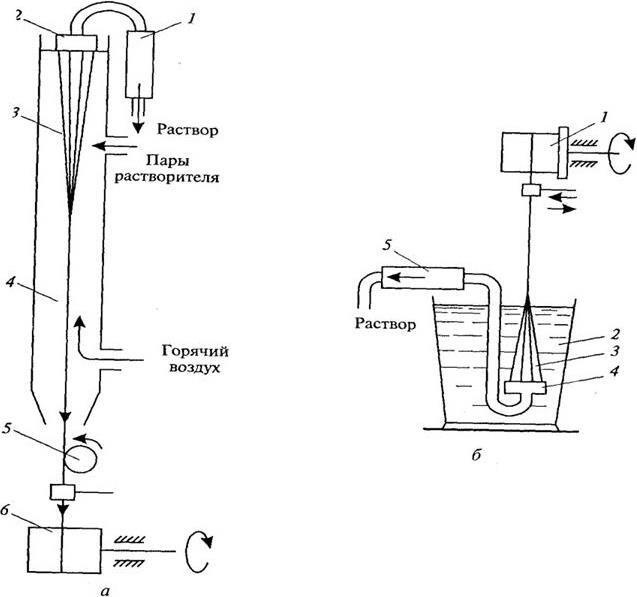 а сухим способом: 1 фильтр; 2 фильера; 3 нити; 4 обдувочная шахта; 5 замасливающий ролик; 6 приемная бобина; б мокрым способом: 1 приемная бобина; 2 коагуляционная ванна; 3 нити; 4 фильера; 5 фильтр