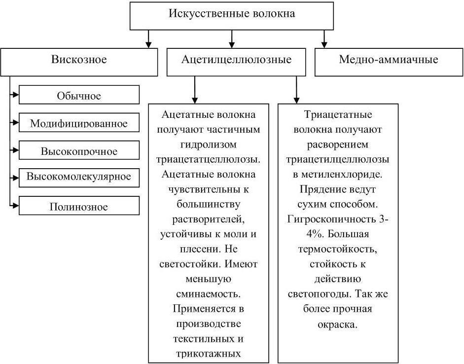 К искусственным относят волокна из целлюлозы и ее производных. Это вискозное, триацетатное, ацетатное волокна и их модификации (рисунок 10).