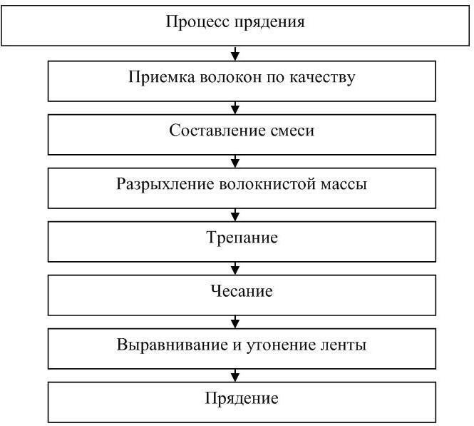 Волокнистая масса натуральных волокон после сбора и первичной обработки поступает на прядильную фабрику. Здесь из относительно коротких волокон вырабатывают непрерывную прочную нить пряжу. Этот процесс называют прядением. Процесс прядения состоит из нескольких стадий (рисунок 15).