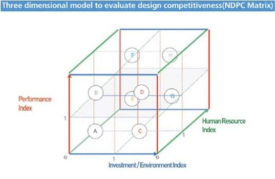 Многомерная модель получила название «матрица NDPS» (National Design Competitiveness Power), с ее помощью можно оценить конкурентоспособность по трем параметрам ориентации на лидерство в дизайне, инвестиционной активности в дизайне, а также с точки зрения человеческих ресурсов для дизайна.