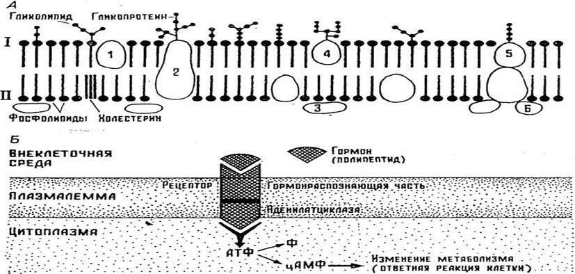 А строение; Б участие в рецепции: I надмембранный слой (гликокаликс); II липопротеиновая мембрана; 1 6 белки.