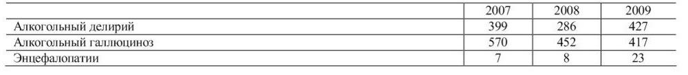 За 2007 год число пациентов с диагнозом «алкогольная энцефалопатия» составило 7 человек, практически все они не работающие люди в возрасте 60 лет. За 2008 г. их стало одним человеком больше. При этом в 2009 году наблюдается резкое возрастание алкогольных энцефалопатий их число достигло 23 человек. Из них 9 пенсионеров 2 инвалида 40 и 45 лет, 2 работающих человека и 10 не работающих людей от 40 лет.
