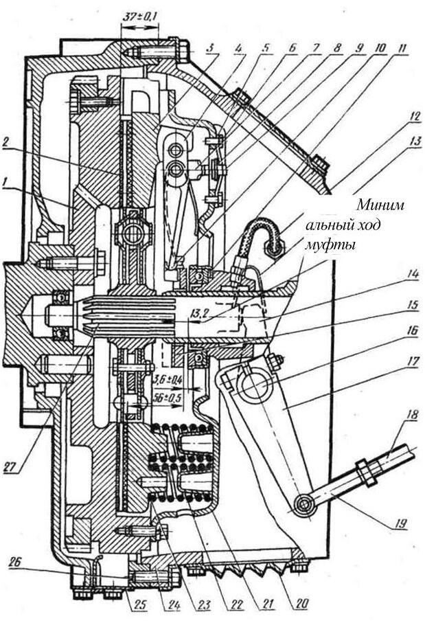 1 маховик; 2 ведомый диск; 3 нажимной диск; 4 рычаг выключения; 5 опорная пластина; 6 болт кропления опорной пластины; 7 вилка рычага выключения; 8 стопорная шайба; 9 регулировочная гайка; 10 пружина нажимного рычага; 11 муфта выключения сцепления; 12 шланг для смазки муфты; 13 пружина; 14 вилка выключения сцепления; 15 упорное кольцо; 16 вал выключения сцепления; 17 рычаг; 18 тяга выключения сцепления; 19 вилка; 20 крышка люки картера сцепления; 21 кожух; 22 нажимная пружина; 23 теплоизоляционная шайба; 24 картер сцепления; 25 крышка люка картера маховика; 26 болт; 27 первичный вал коробки передач