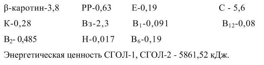 В состав СГОЛ-1 входят ценные компоненты: витамины А, В1 В2, Вз, В4, В6, С, Е, Н, К, РР; аминокислоты, продукты гидролиза белков и нуклеиновых кислот; соли молочной кислоты, углеводы, олигосахариды и молочнокислые бактерии. Солевой состав препарата скоррелирован организмом коровы и содержит все компоненты, необходимые для нормального развития млекопитающих. Высокое содержание пробиотических компонентов сообщает препарату СГОЛ-1 лечебнопрофилактические свойства. Препарат обладает широким спектром действия, стимулирует работу пищеварительного тракта, нормализует моторно-секреторную деятельность желудка и кишечника, профилактирует возникновение воспалительных процессов в них.
