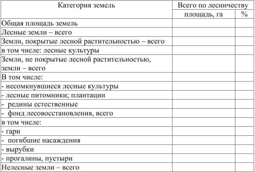 Характеристика лесного фонда должна содержать следующие сведения с оценкой сложившегося состояния: общую площадь и ее деление на основные категории земель (таблица 3), деление лесного фонда предприятия по целевому назначению и категориям защитности лесов (таблица 4), а для лесопокрытой площади распределение покрытых лесом земель и запасов древесины по классам возраста (таблица 5).