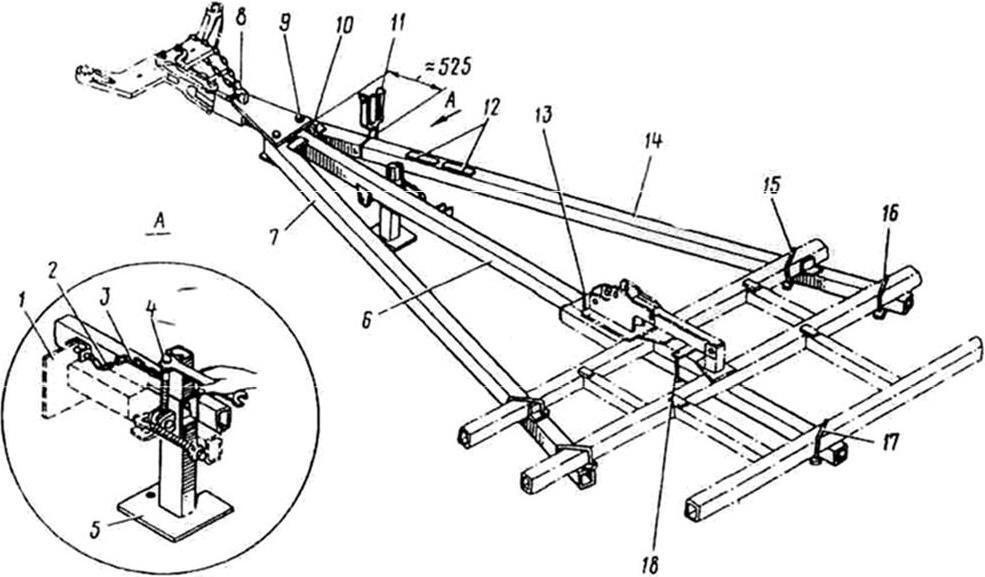 Рисунок 3.5 Сница: А положение подставки при работе (транспортировании): 2 положение замка для фиксации подставки в рабочем положении; 3 положение замка для фиксации подставки при отсоединении культиватора от трактора; 4 винт; 5 положение подставки при отсоединении культиватора от трактора; 6 тяга; 7, 14 лучи; 8 цепь страховая, ось 25×80, шплинт пружинный5,0×64; 9 болт 2М20×120, гайка М20, шайба 20, шплинт 4×40; 10 болт М120x75, гайка М20, шайба 20 65Г; 11 держатель рукавов высокого давления, 12 табличка; 13, 17 скоба 2М20×149×200, гайкаМ20, шайба 20.65Г; 5, 16 скоба 2М20×132×200, гайкаМ20, шайба 20 65 Г; 18 скобы 2М20×102×200, гайкаМ20, шайба 20 65Г
