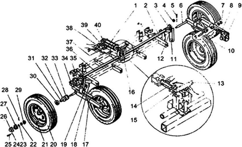 Рисунок 3.6 Механизм подката:1 винт; 2, 36 вал; 3, 16, 17 масленка 1.2.Ц6; 4 втулка; 5 шплинт 10×90, втулка, компенсатор; 9 ступица;10 ось 20×95, шплинт 5×32, 11 толкатель; 12 ось 32×140, накладка, шплинт 8×56; 13 положение фиксатора при работе культиватора; 14 положение фиксатора при дальнем транспортировании; 15 ось25×120; 18 шплинт 8×56; 19 накладка; 20 шина 6,5×x16; 21 диск и обод; 22 шайба; 23 гайка М20; 24 шайба 12.65Г; 25 болт М12×20; 26 крышка, 27 прокладка, 28 шплинт 4×40; 29 подшипник 207; 30 подшипник 208; 31 втулка; 32 манжета 55×80; 33 колпачок; 34 опора, болт M16×40 болтМ16×100. гайка М16. шайба 16×4. шайба 16 65Г; 35 ось 32×140; 38 втулка; 39 ось 32×105 накладка, шплинт 8×56; 40 качалка