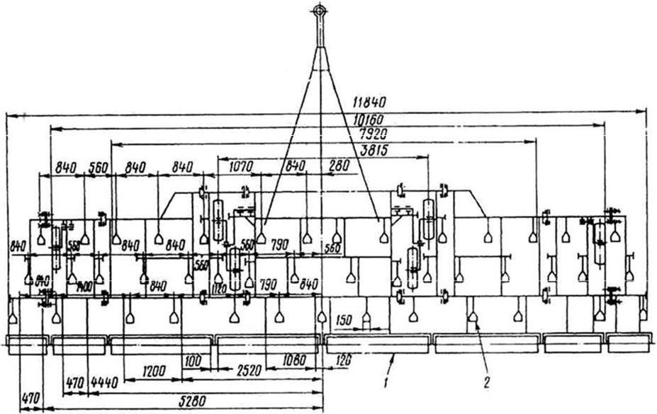 Рисунок 3.17 Схема расстановки рабочих органов: 1 боронка роторная; 2 рабочий орган