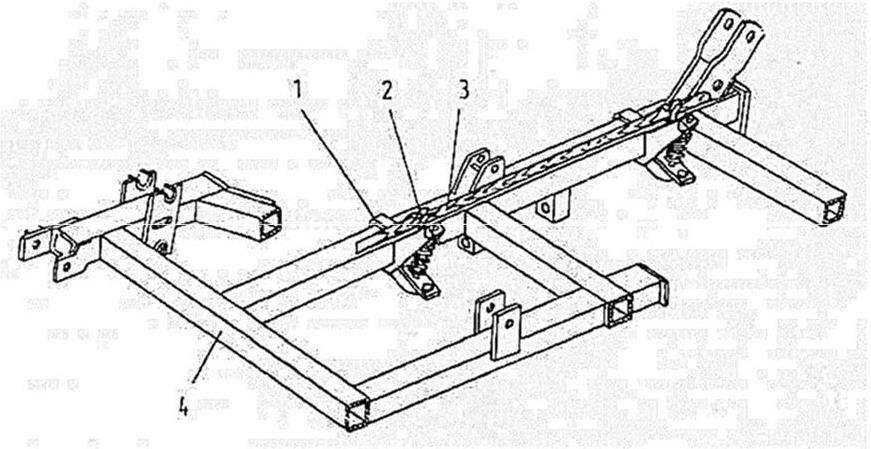 Рисунок 3.14 Чистик: 1 кронштейн подвески рабочих органов; 2 пружина; 3 чистик; 4 рама (крыло)