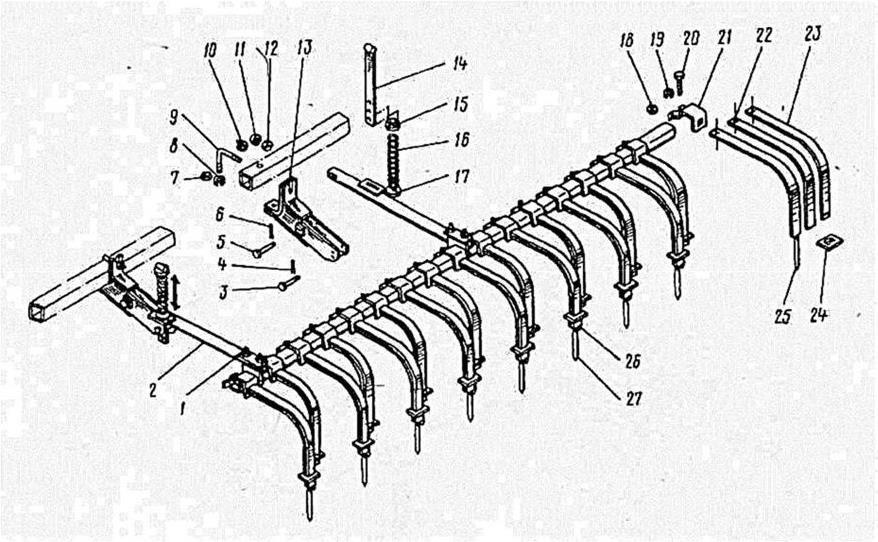 Боронка пружинная (рисунок 3.13) представляет собой набор зубьев 25 с подпружинниками 22, 23, установленными на брусе.