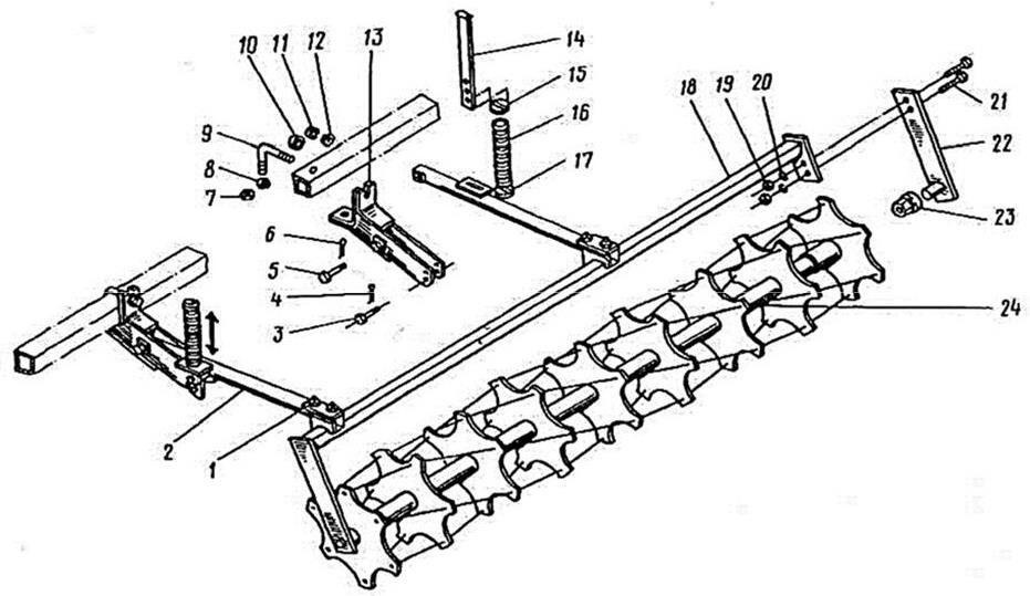 Рисунок 3.12 Боронка роторная:1 скоба 2М16×61×115; 2, 22 тяги; 3 ось 12×65; 4 шплинт 3,2×20; 5 ось 16×75, 6 шплинт 4,0×25; 7, 12, 19 гайки М16;8, 11, 20 шайбы 16.65Г; 9 скоба 5М16×115×120; 10 шайба 16.02; 13 кронштейн; 14 штанга нажимная; 15, 17 колпачок; 16 пружина, 18 вага; 21 болт М16×45; 23 подшипник; 24 ротор