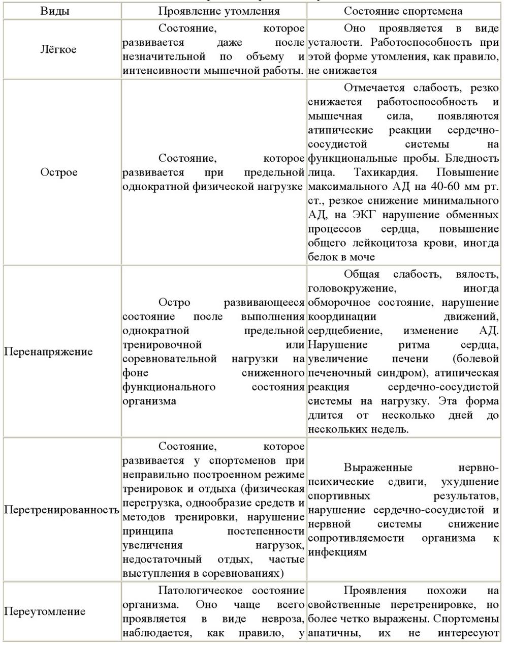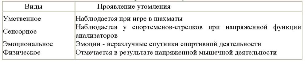 Существуют многочисленные попытки классифицировать утомление. Так, различают четыре основных вида утомления (табл. 1).
