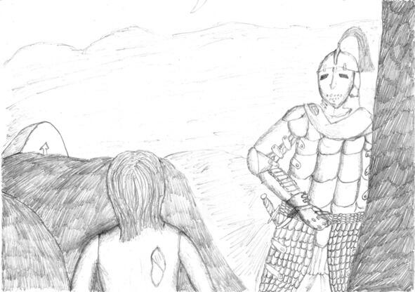 Через некоторое время Рони увидела впереди белёсый камень. Такие плоские камни ставили на дорогах, чтобы путники не заблудились. Когда девочка уже почти подошла к нему, рядом просвистела стрела с жёлтым древком. Рони испуганно вскрикнула, и возле неё неожиданно выросла фигура в чёрных доспехах. Всадник что-то крикнул, обращаясь к девочке. Но Рони была насмерть перепугана и смогла только прошептать: «Не надо, не убивайте!» Всадник перехватил её за талию и закинул на седло. При этом сделал это довольно аккуратно, укрыв полураздетого замёрзшего ребёнка своим плащом.