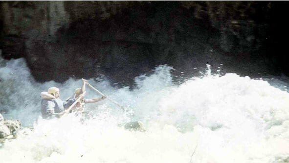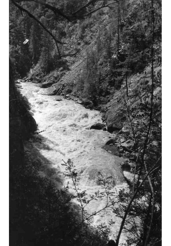 «Июль 19. Утром сильный дождь. Расползлись по палаткам. Акутин перебирает тряпье в подушке. Облака ползут по полке Мажоя. Заснул. Рядом сопят Акутин и Эдик. В 12 вроде бы дождь закончился. Перекус. Потопали на реку. Все прошли «Майскую» нормально. Все вместе пошли с взаимостраховкой длинную (2км?) шиверу 7. Валы фантастические. Мотает как в проруби. Рамыч с командой ввалились в центр выходной бочки по уши. Мощь воды страшенная. По-моему, я на такой воде еще не бывал.
