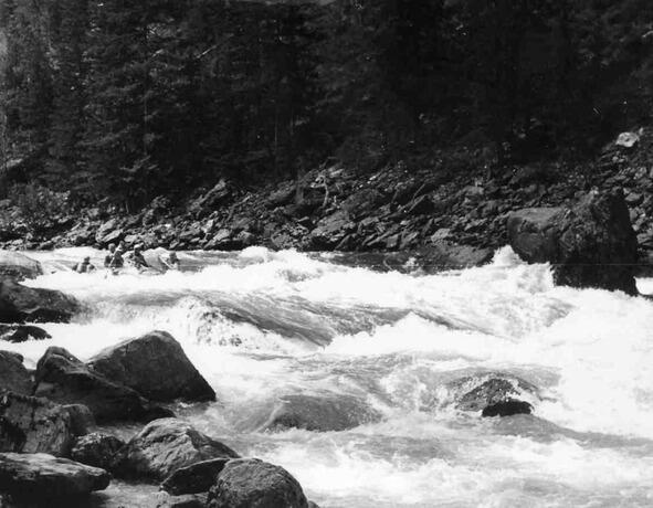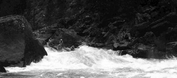 Сразу за ним начинается порог 142 «Мельница» (кат. сл. 5 6). Его длина 250 м. В пороге очень сложная линия движения среди мощных сливов и бочек. Далее до впадения справа реки Оныш несложные препятствия 143 148. В устье Оныша лучшее место для стоянки в Нижнем ущелье.