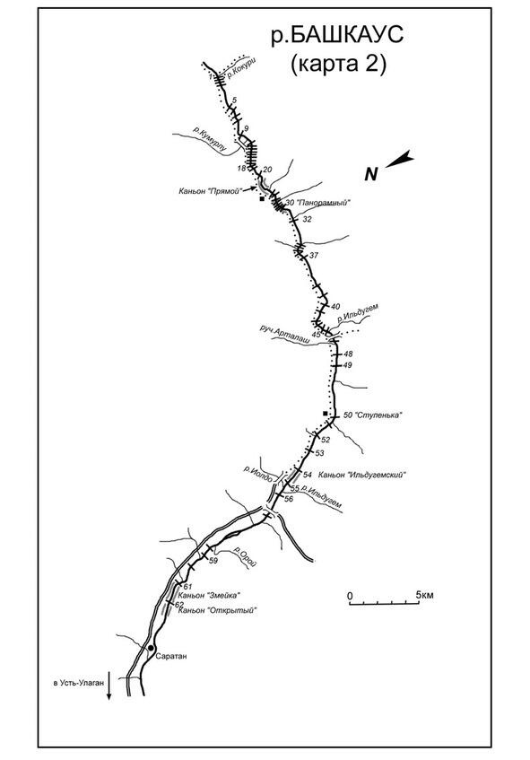 Препятствия 63 68 несложны и заканчиваются у р. Атур-Коль. Далее после третьего, хорошо заметного ручья слева, надо остановиться у правого берега для осмотра порога 72 «Предбанный» (кат. сл. 3). Порог переходит в сложный 8 километровый каньон «Саратанский». Дорога идет по правому берегу над каньоном. Спуститься в каньон можно через 1 км после его начала, сразу за порогом «Камень преткновения». Этот порог (кат. сл. 5) наиболее сложен в каньоне. Очень мощная бочка, а за ней сильный навал струи на скалы слева и справа. Далее в каньоне препятствия 3 4 кат. сл., которые можно идти на взаимостраховке. Большие (до 2 метров) валы. Река выходит из каньона в широкую долину, через 7 км сплава на правом берегу расположено большое селение Усть-Улаган. Ниже до села Кара-Кудюр препятствий нет. В описании нижней части Башкауса я использую мой хронометраж хода между препятствиями при средней воде.