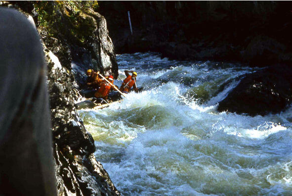 Через 5 минут сплава от Оныша технически довольно сложное препятствие 153 (кат. сл. 4). Обязательна разведка этого препятствия. Слева скала. Проходить вплотную к ней. Попытка пройти справа неизбежно приведет к тому, что судно прижмет в «кармане». Через минуту сплава слева впадает ручей и еще через 4 минуты справа со скалы с высоты 60 70 м падает еще один.