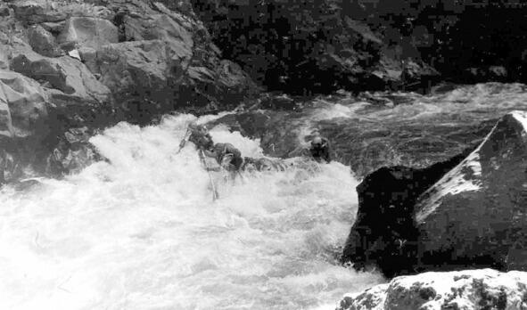 Перед порогом 202 река «останавливается». Сильный подпор создан оползнем в 1987 году. Порог 202 (кат. сл.6) представлял собой в момент нашего прохождения в 1989 году систему водопадов 3, 5, 2 м. Мы делали очень трудный и опасный обнос по осыпи. Как и все пороги селевого происхождения, за несколько лет порог кардинально изменился, но по-прежнему требует внимания.
