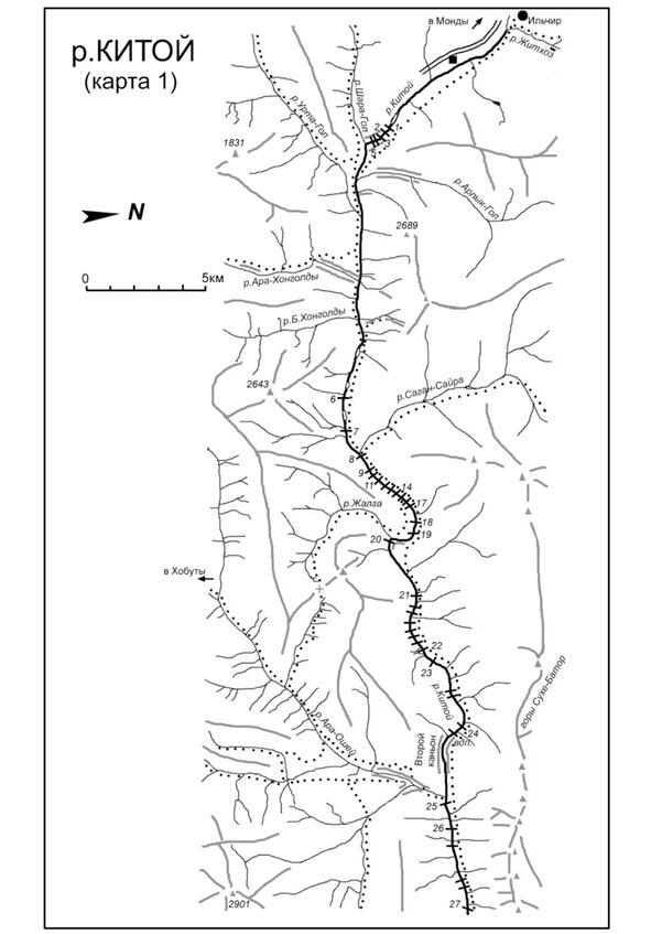 8км Справа в Китой впадает река Шара-Гол. Еще 0.5км конец 1-го каньона. Его общая длина около 1км. В конце каньона справа хорошая стоянка. До реки Ара-Хондолдой справа (19км) течение имеет очень высокую скорость, значительные валы, но технически река несложна.